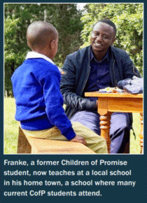 In 1997, just five years after Children of Promise was founded, Franke started his sponsorship journey. Franke grew up in a remote mountain village, walking to school each day on red dusty roads. His faithful sponsor consistently skipped stones of generosity, making it possible for Franke to be consistent in pursuing his education. He did so well in high school that he was awarded an opportunity to go to university to pursue a BA in Education.