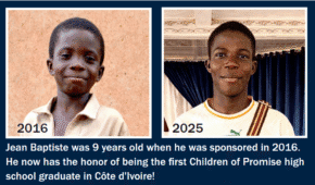 In 2016, a nine-year-old boy named Jean Baptiste was sponsored in Côte d’Ivoire. Trilingual and full of life, he loved music, soccer, and basketball. After his father passed away, it was difficult for his mother to provide for the family selling vegetables from her garden.